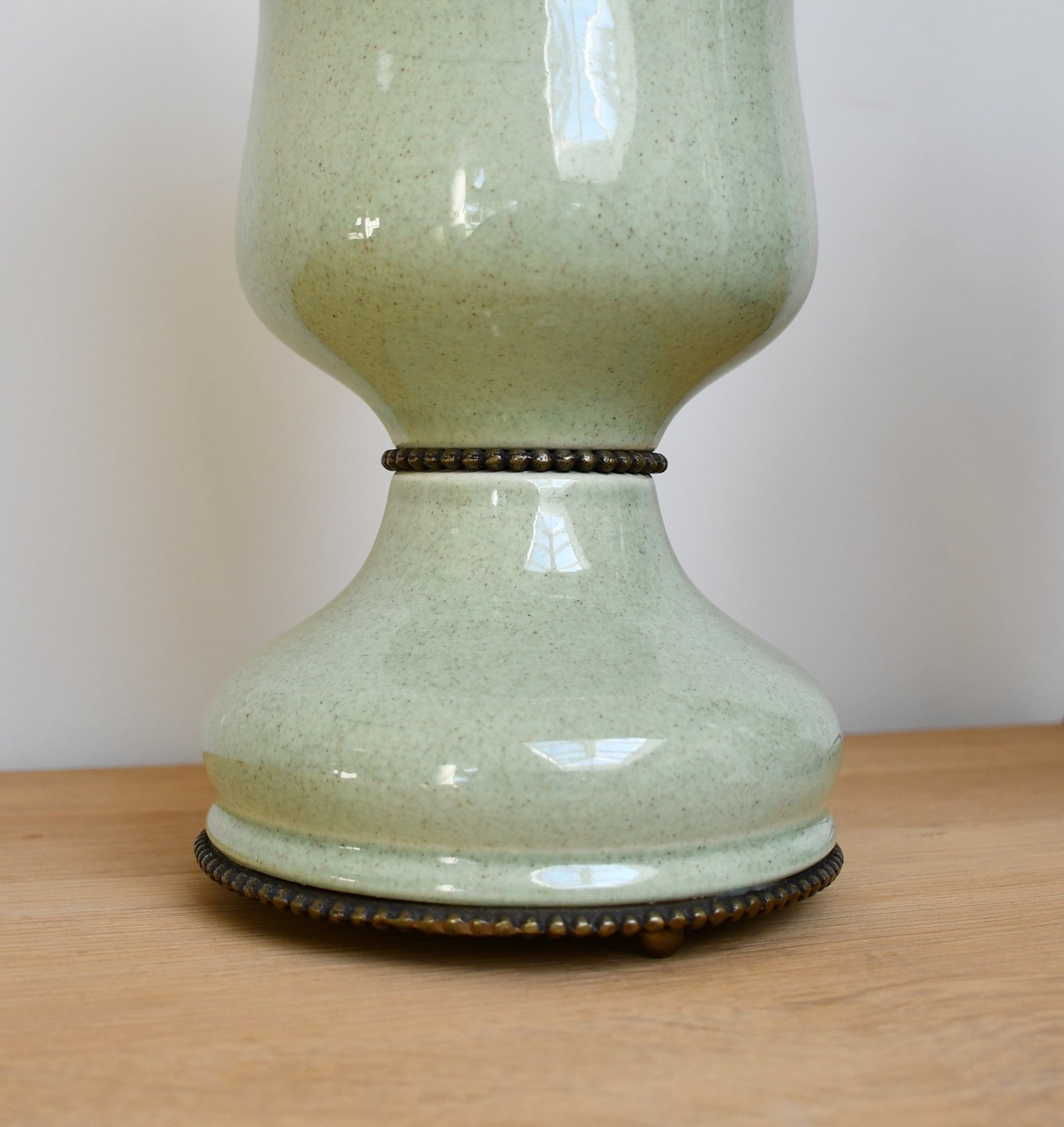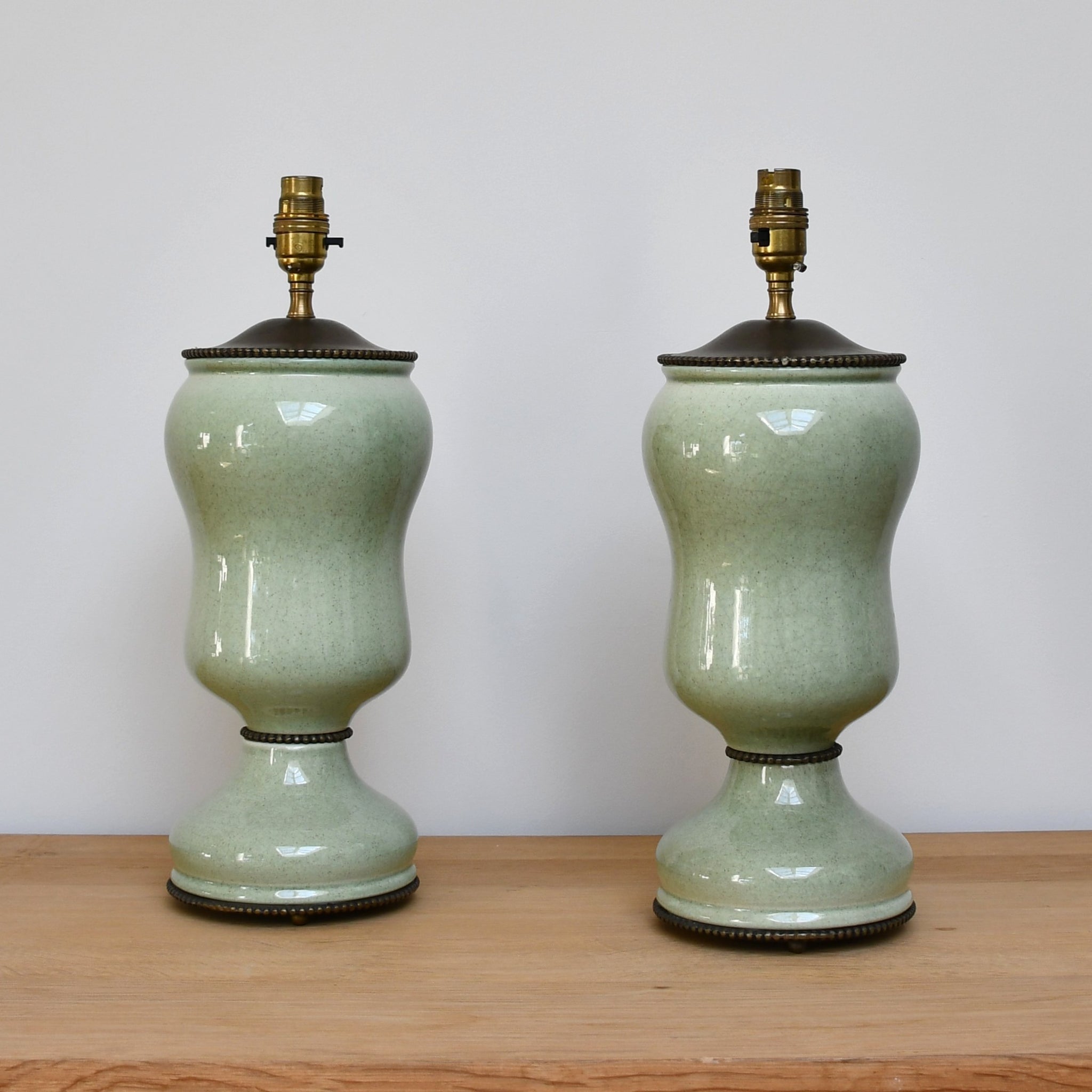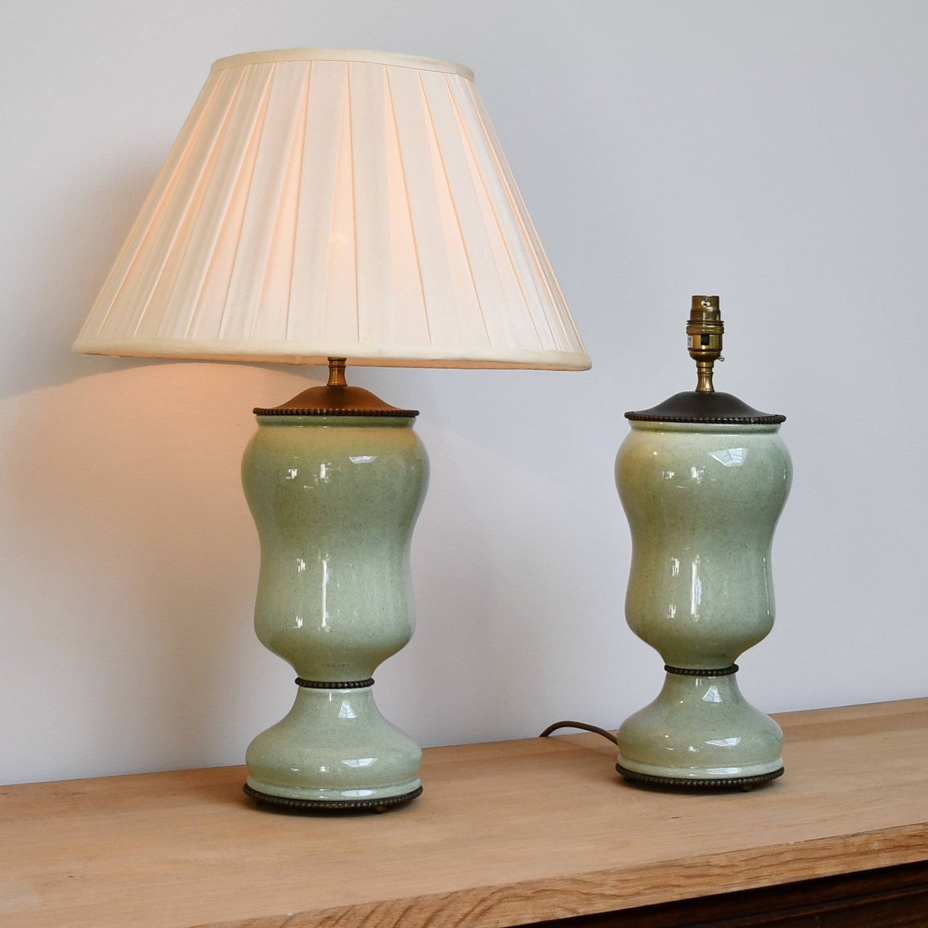 Attractive pale green glazed lamps, with bronzed coloured brass beaded detailing.