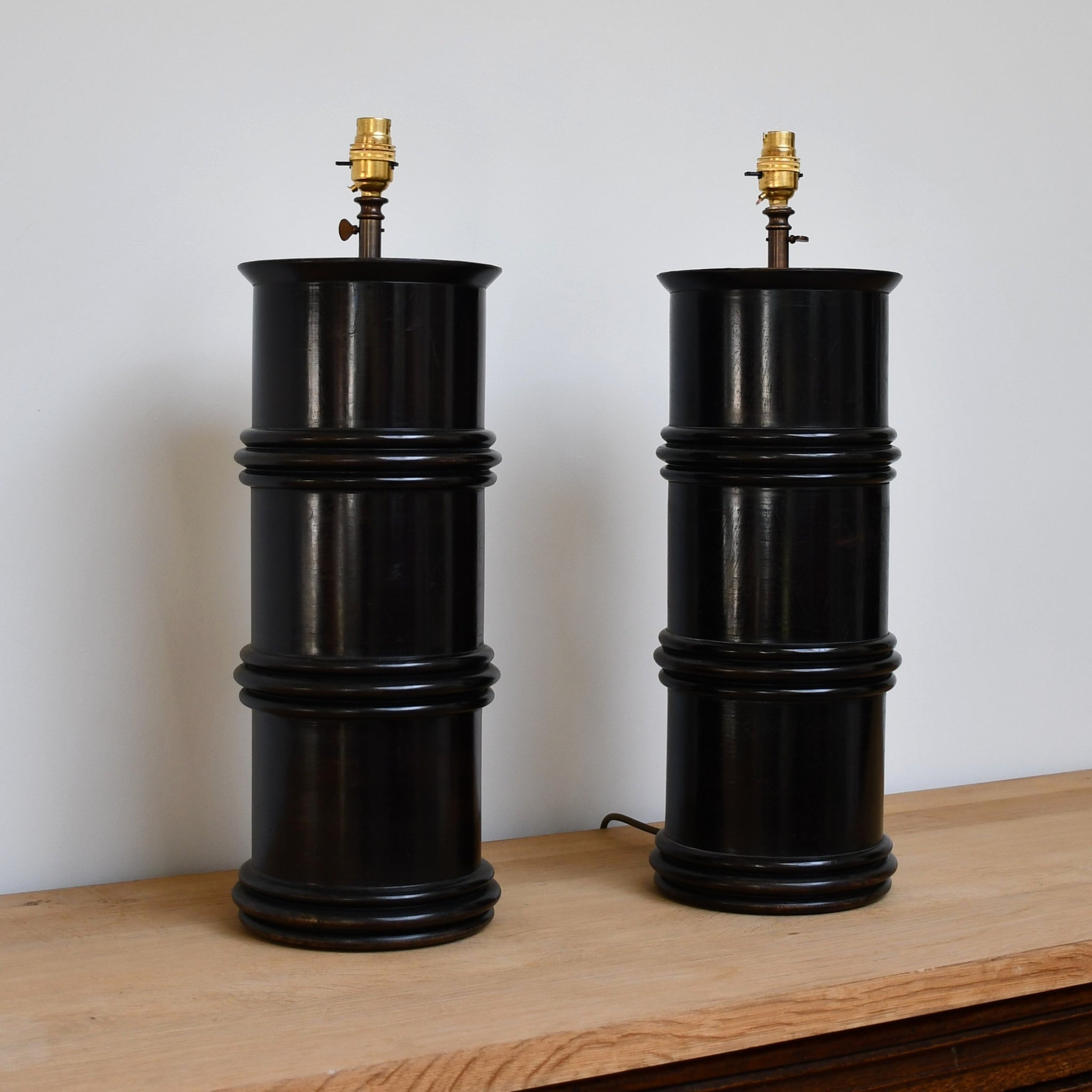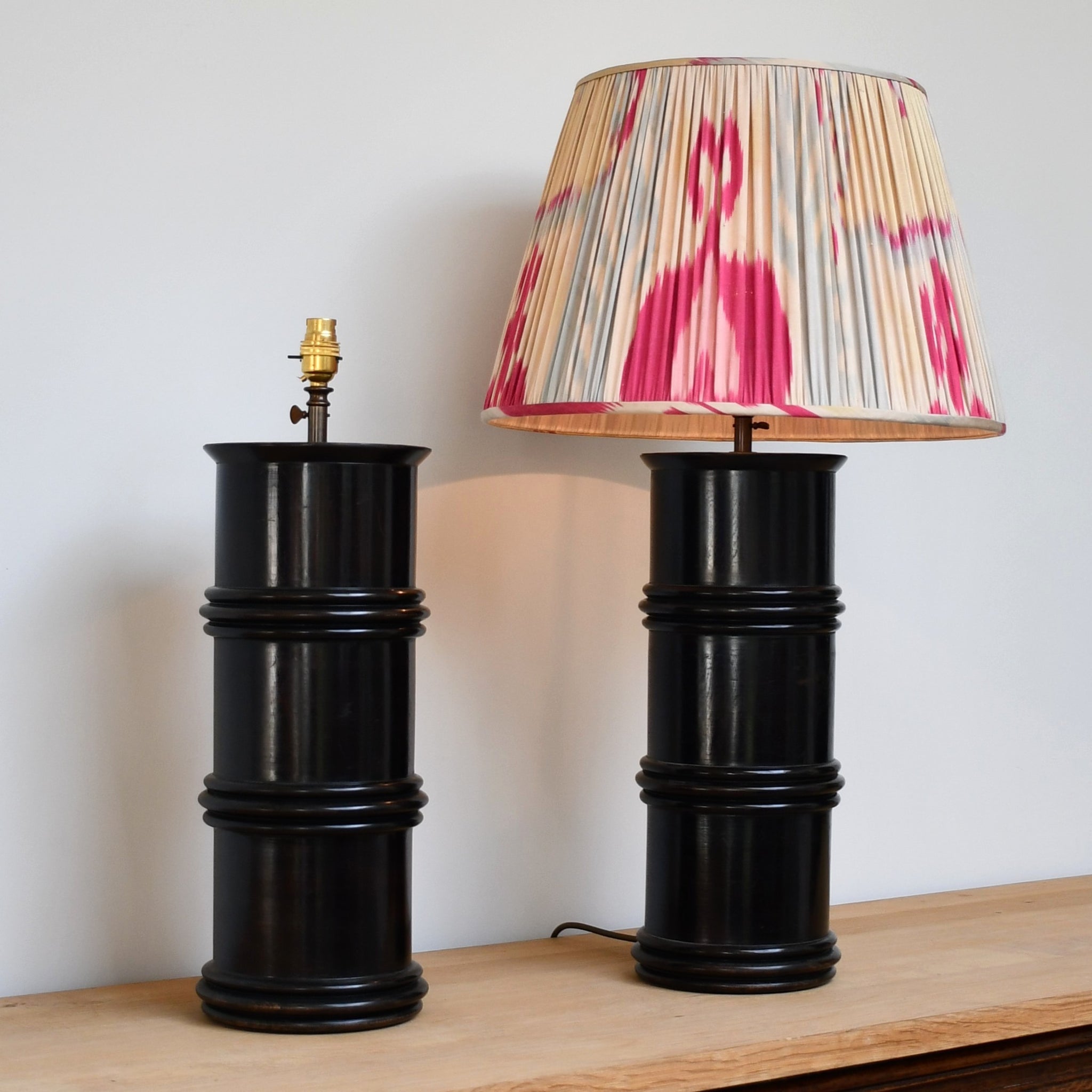 Large cylindrical form with ring turned embellishments of wood construction, both displaying ebonised painted finishes with adjustable brass fittings.