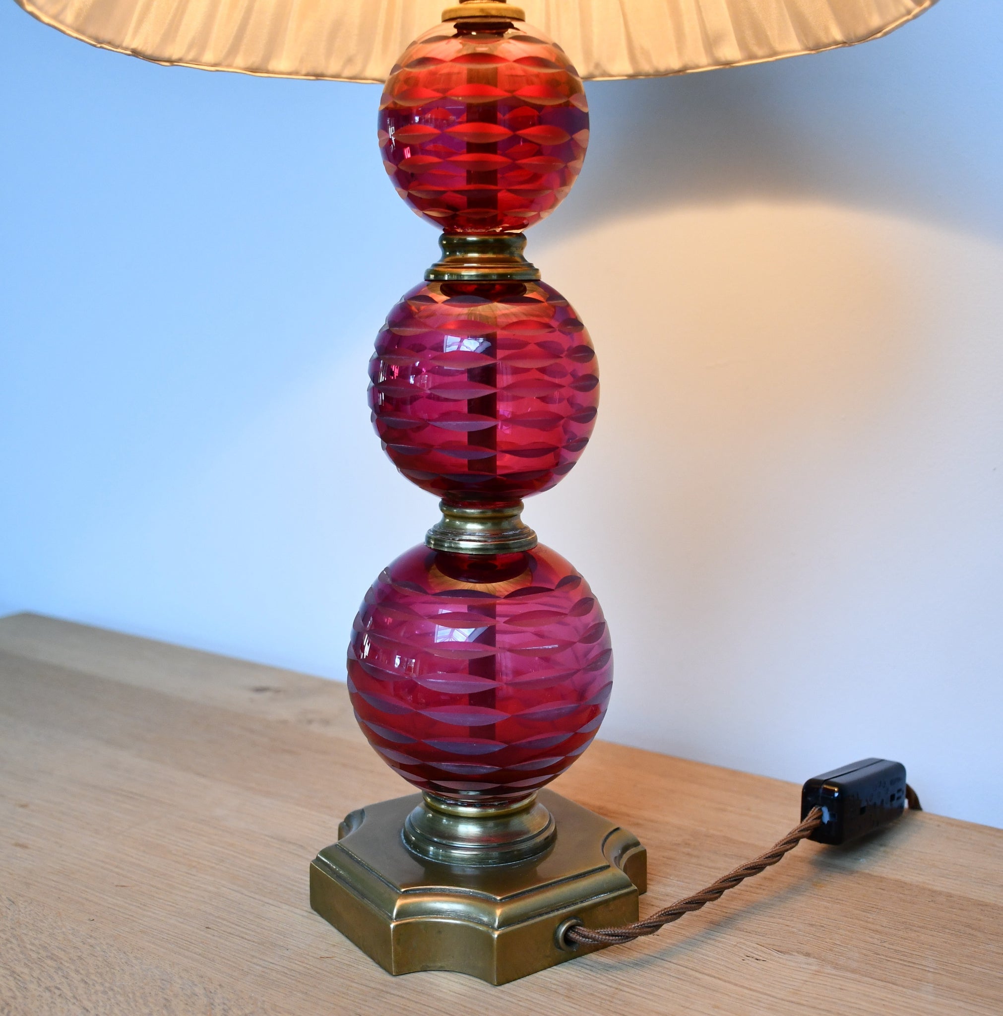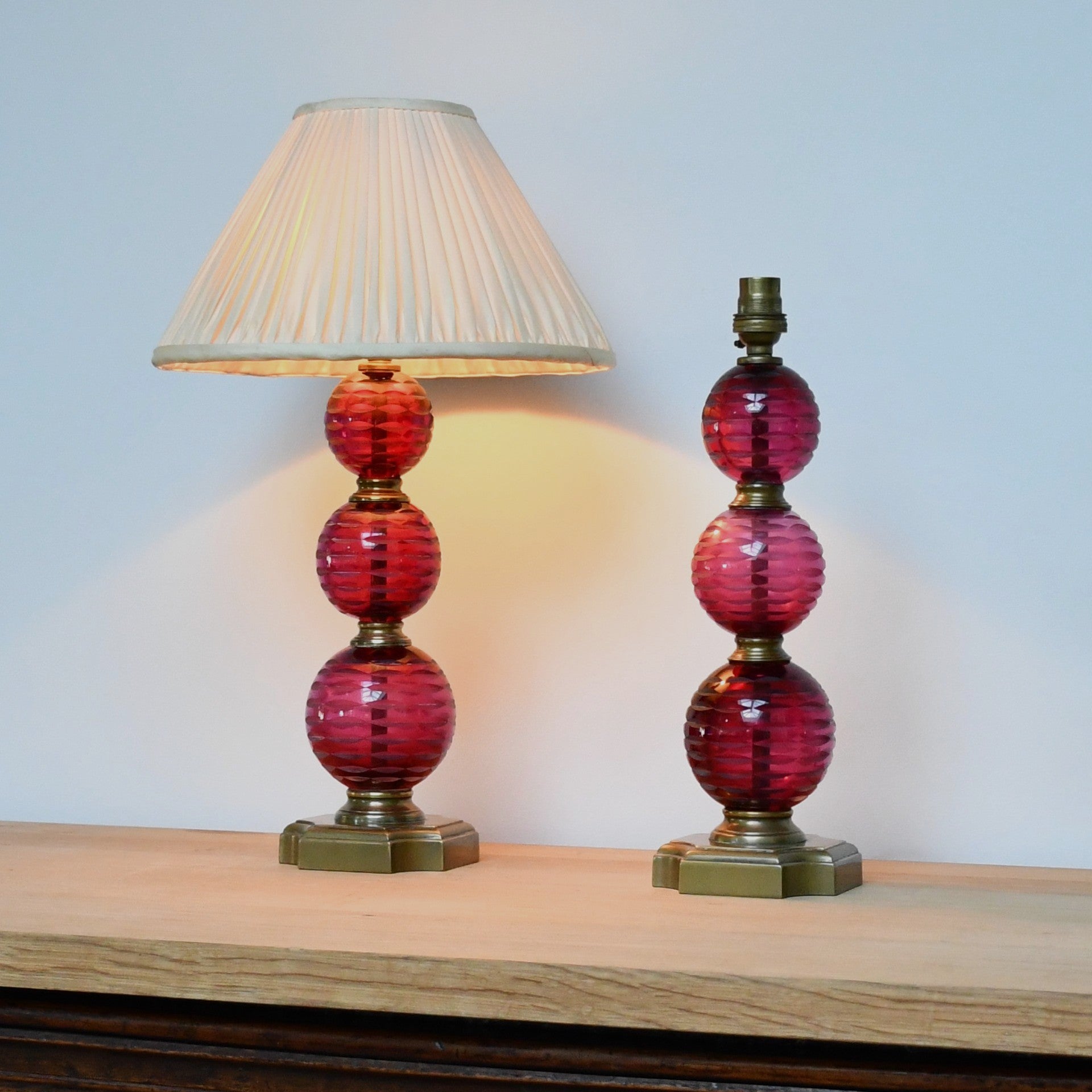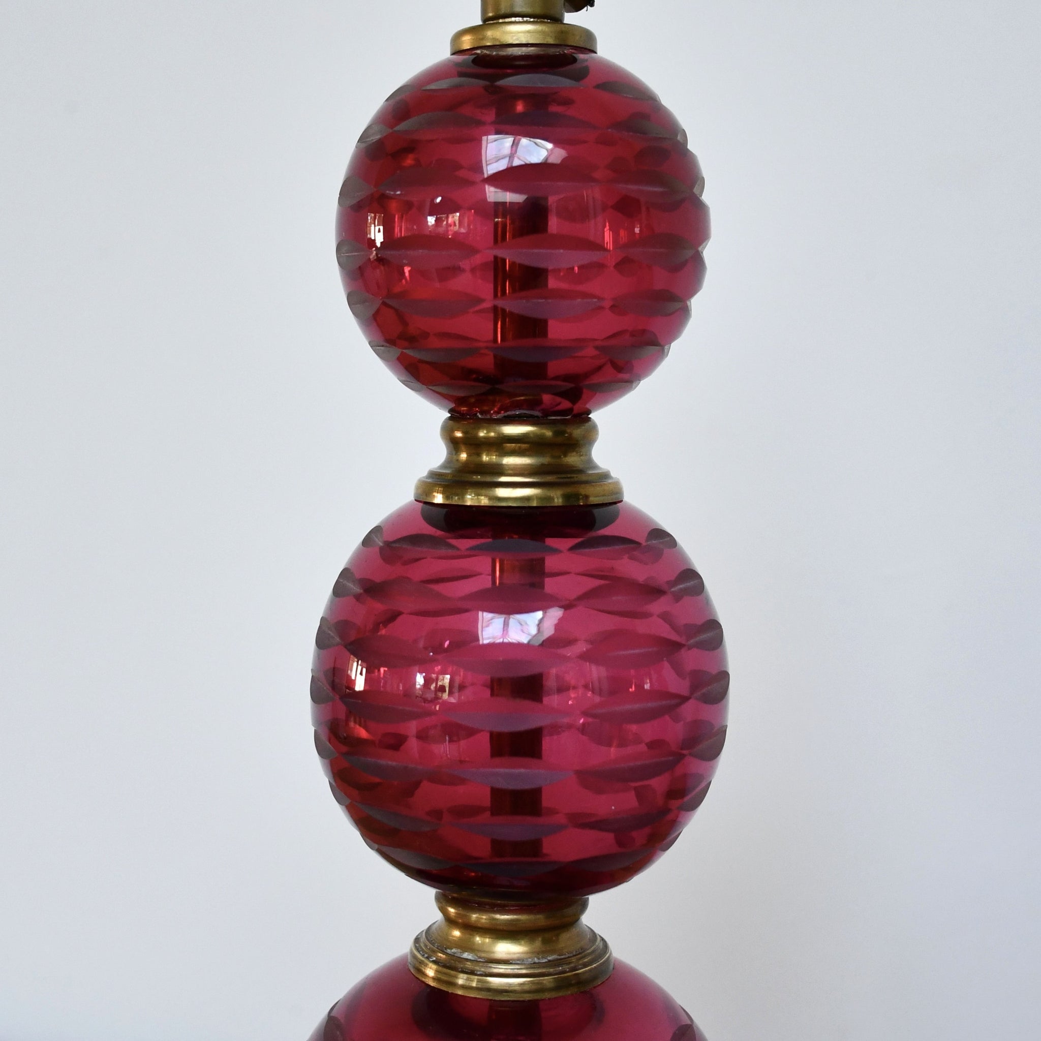 Cut glass, cranberry coloured ball formed table lamps with brass fittings.