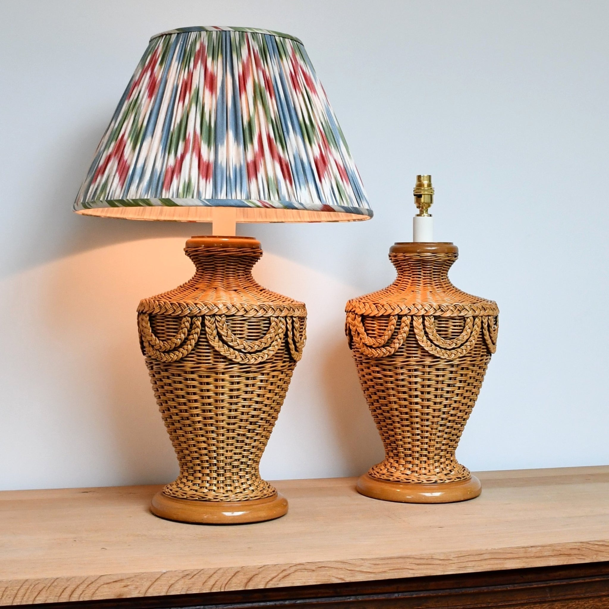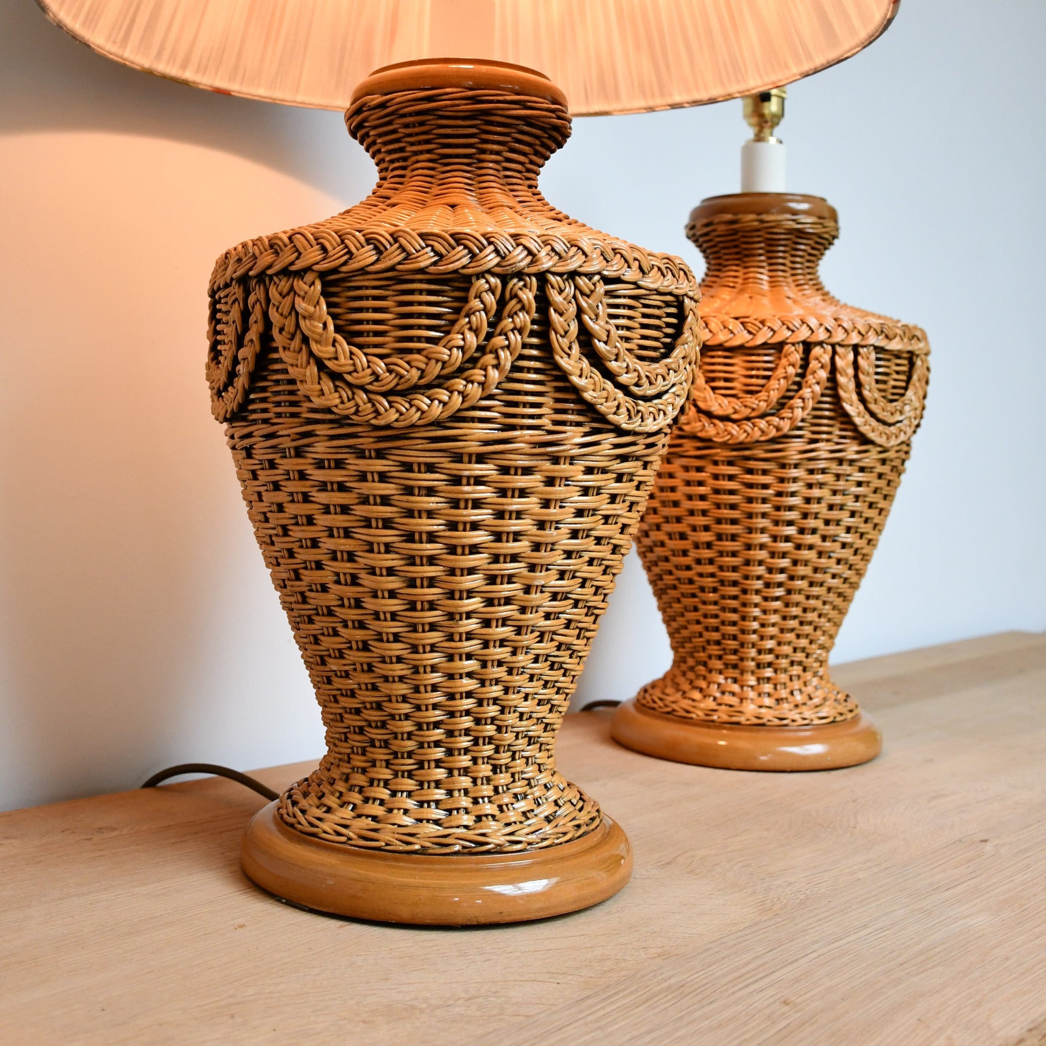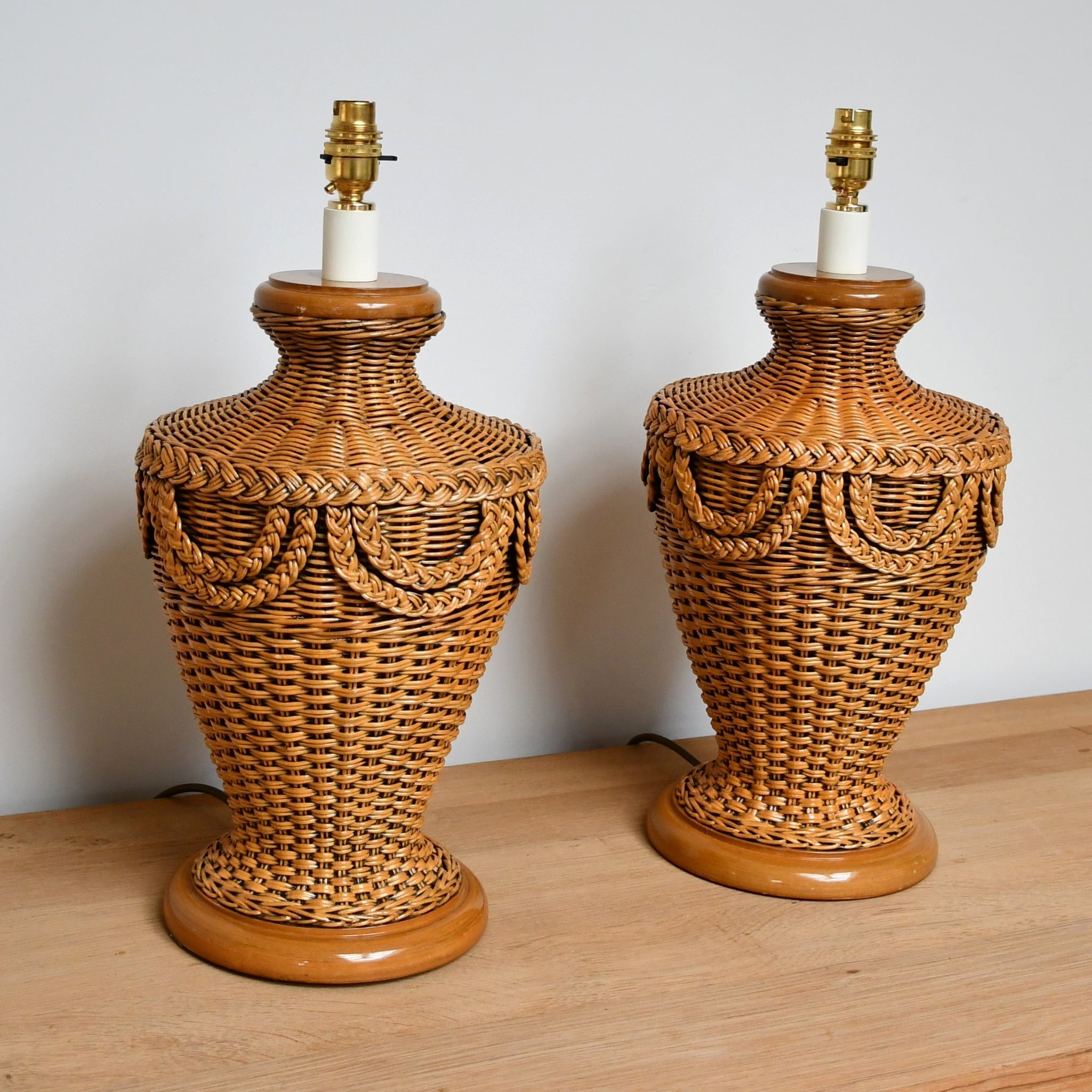 Featuring decorative rattan frames of urn shape form with swags, surmounted with candle cards and brass fittings.