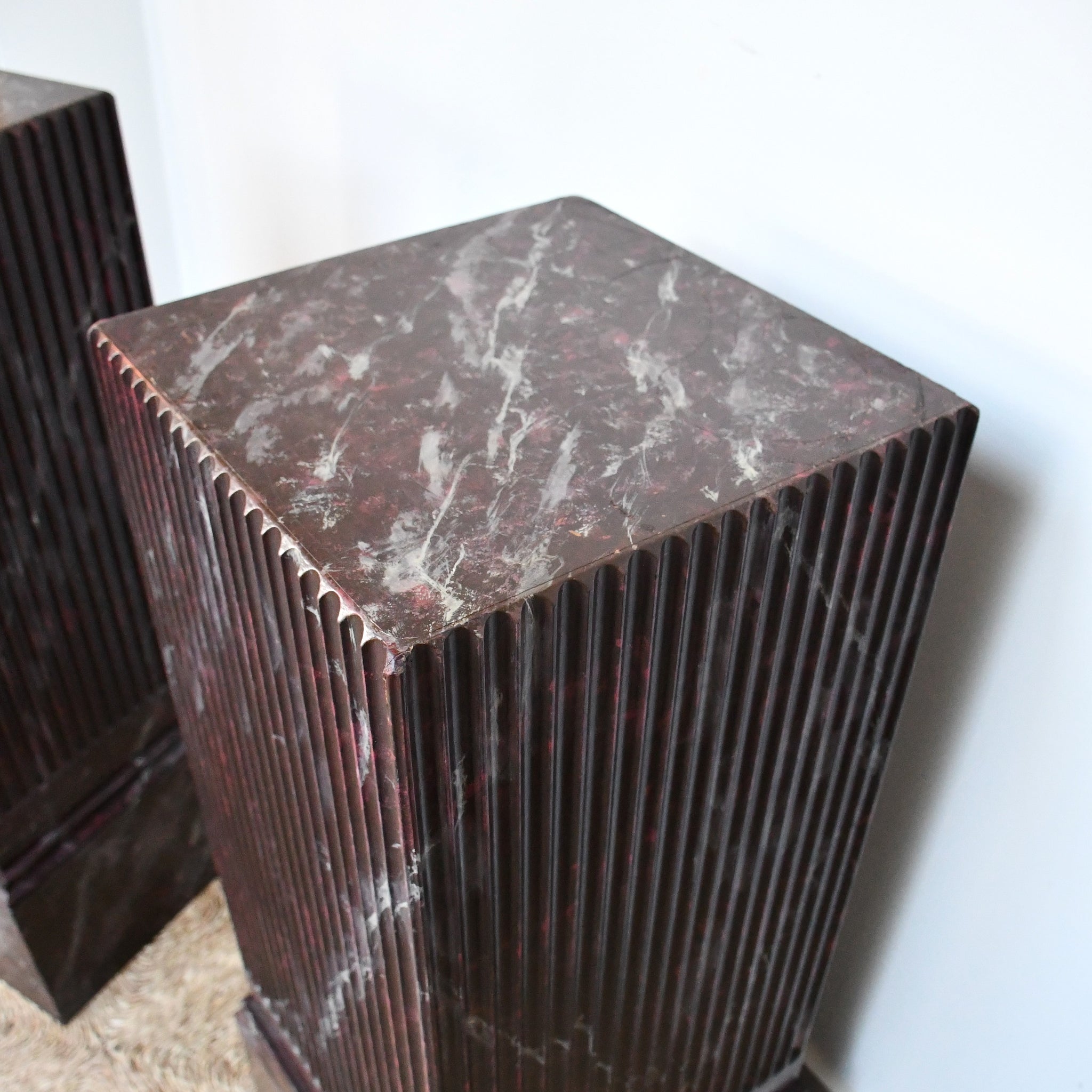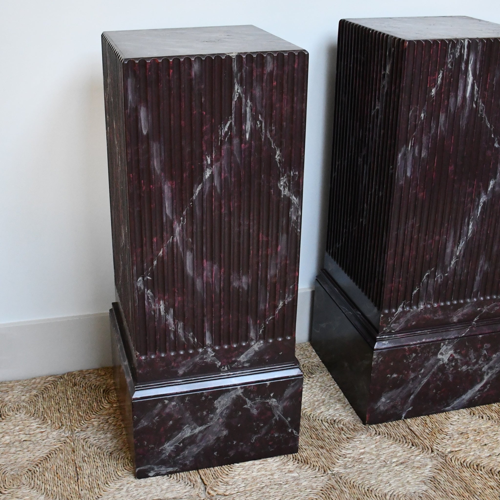 Attractive heavy wood pedestals, painted to simulate Rouge Royale marble, displaying fluted bodies terminating in moulded plinth bases.