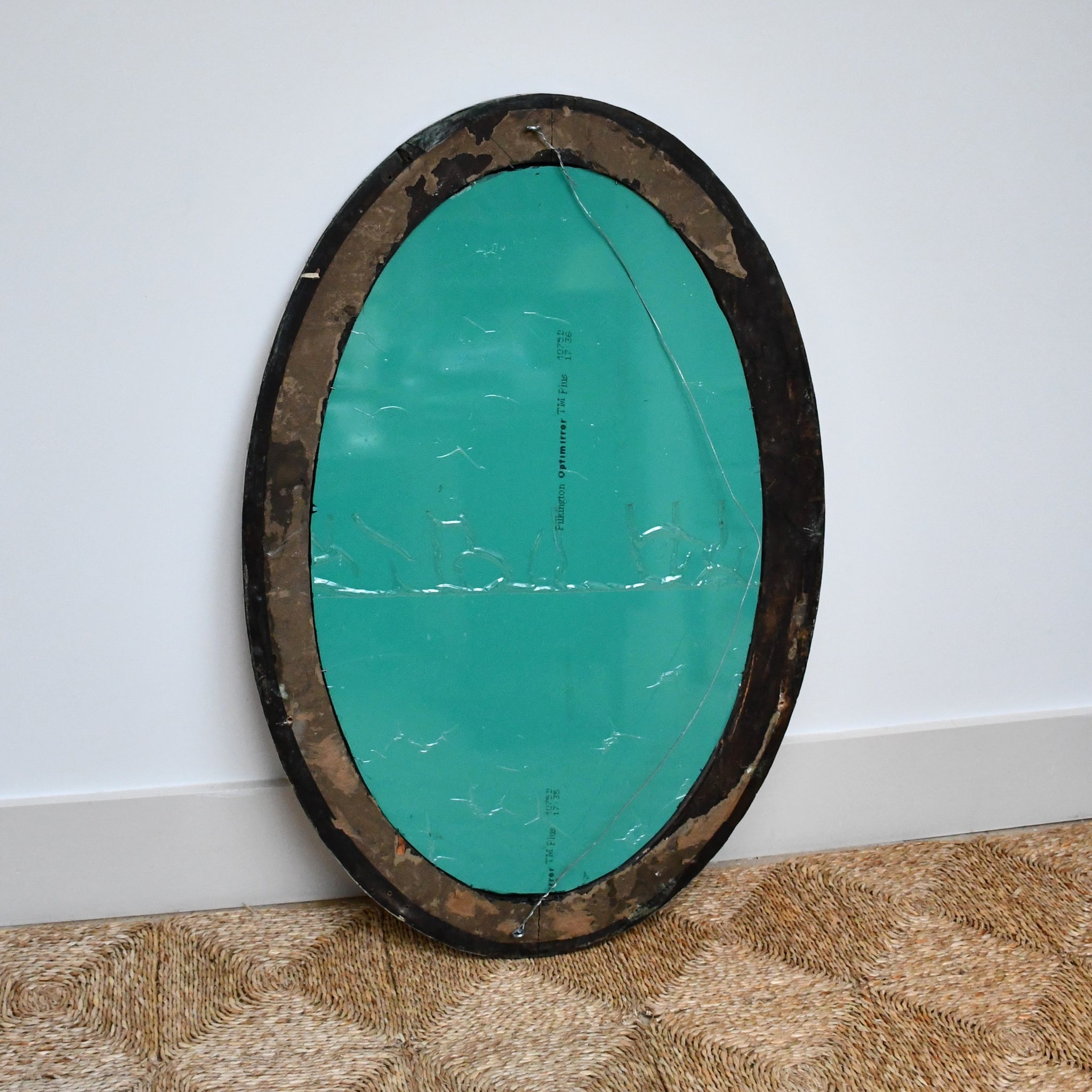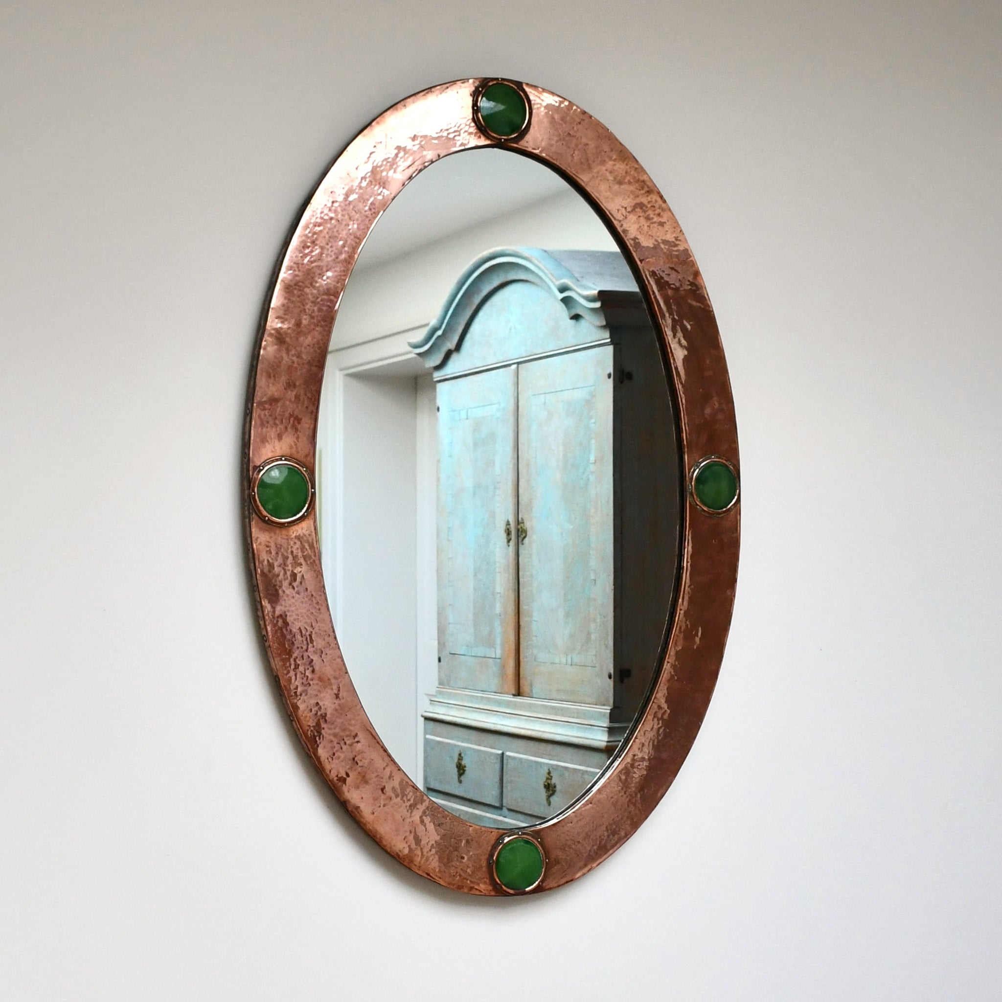 Large oval framed copper mirror, displaying a planished finish - inset with four green Ruskin pottery cabochons in the manner of Liberty & Co.