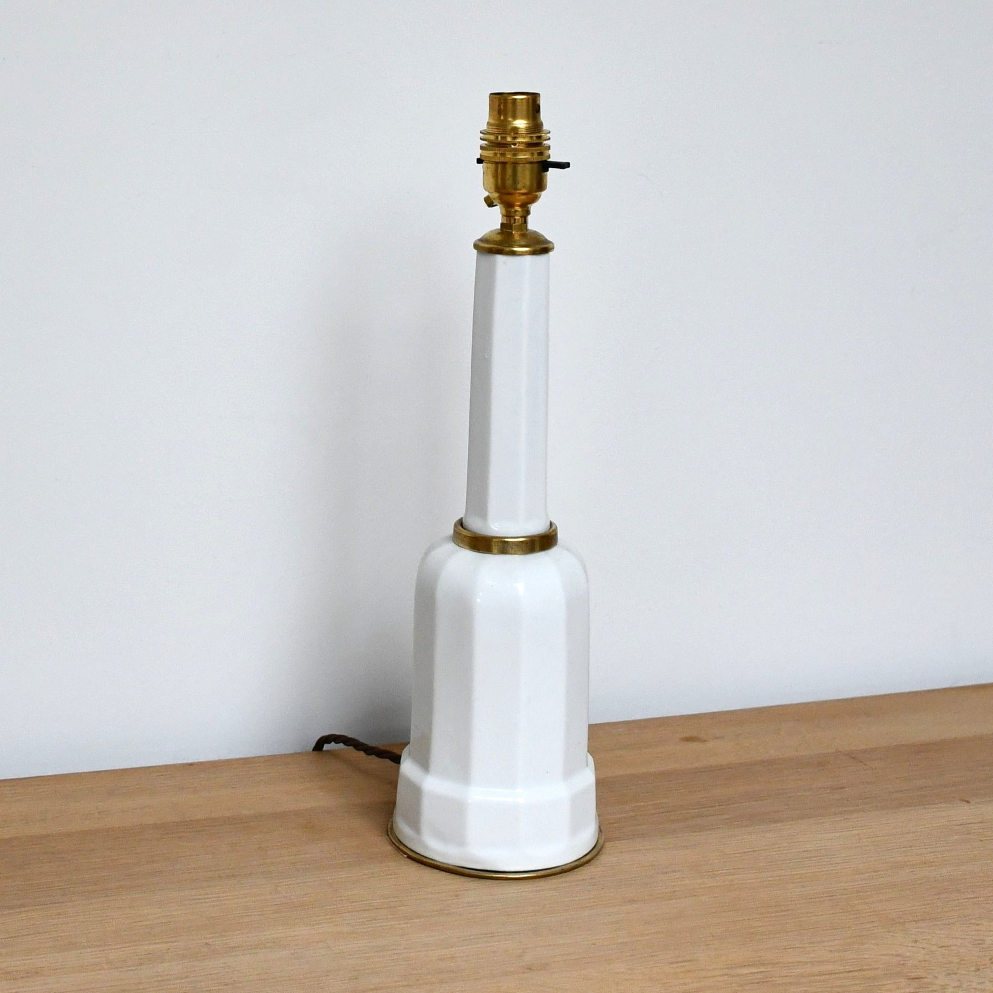 Displaying a ribbed white glazed porcelain body with brass fittings, produced by Soholm.