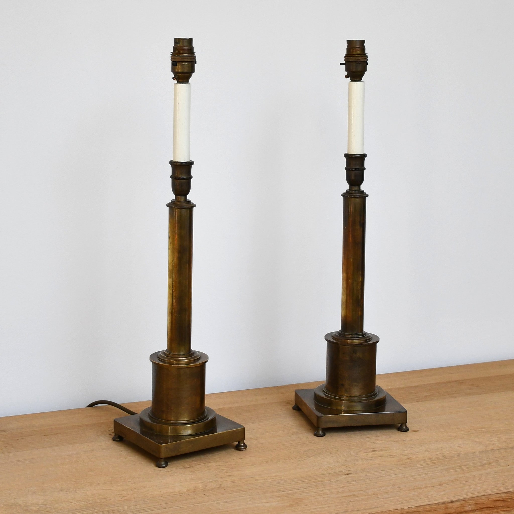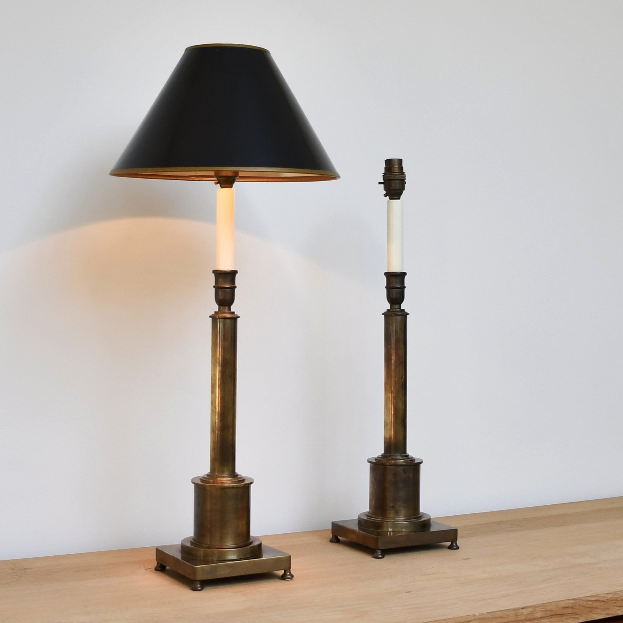 High quality candlestick lamps, constructed of brass, featuring adjustable column stems.